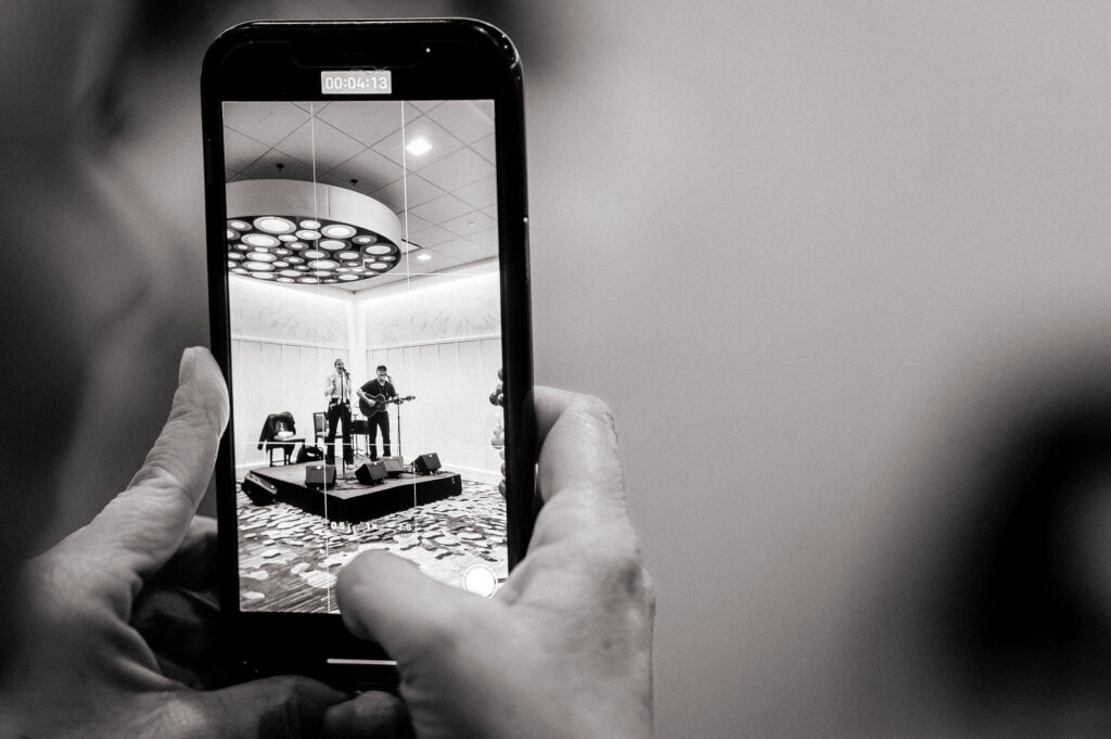 Capturing moments from a live performance alongside the reactions of guests helps document the atmosphere of the event and the connection between the entertainment and the audience.